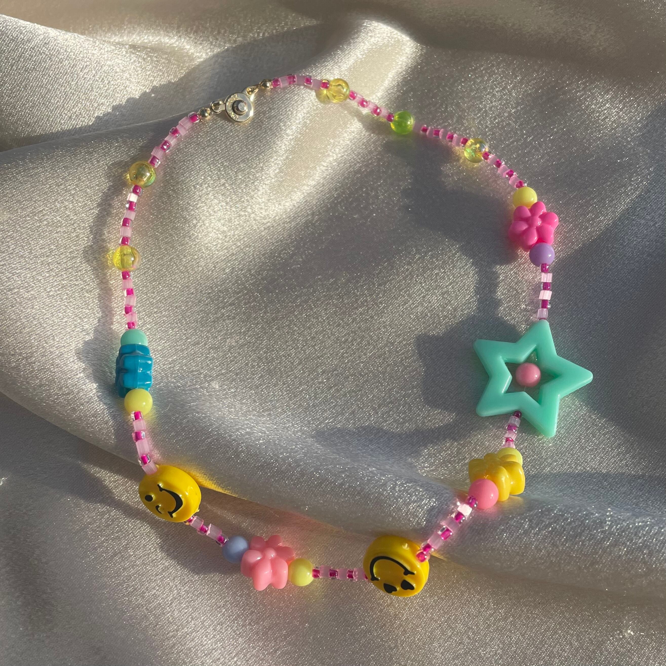 2種類のピンクをベースにカラフルなフラワービーズと大きめスタービーズを使用してキュートなデザインにしました♪