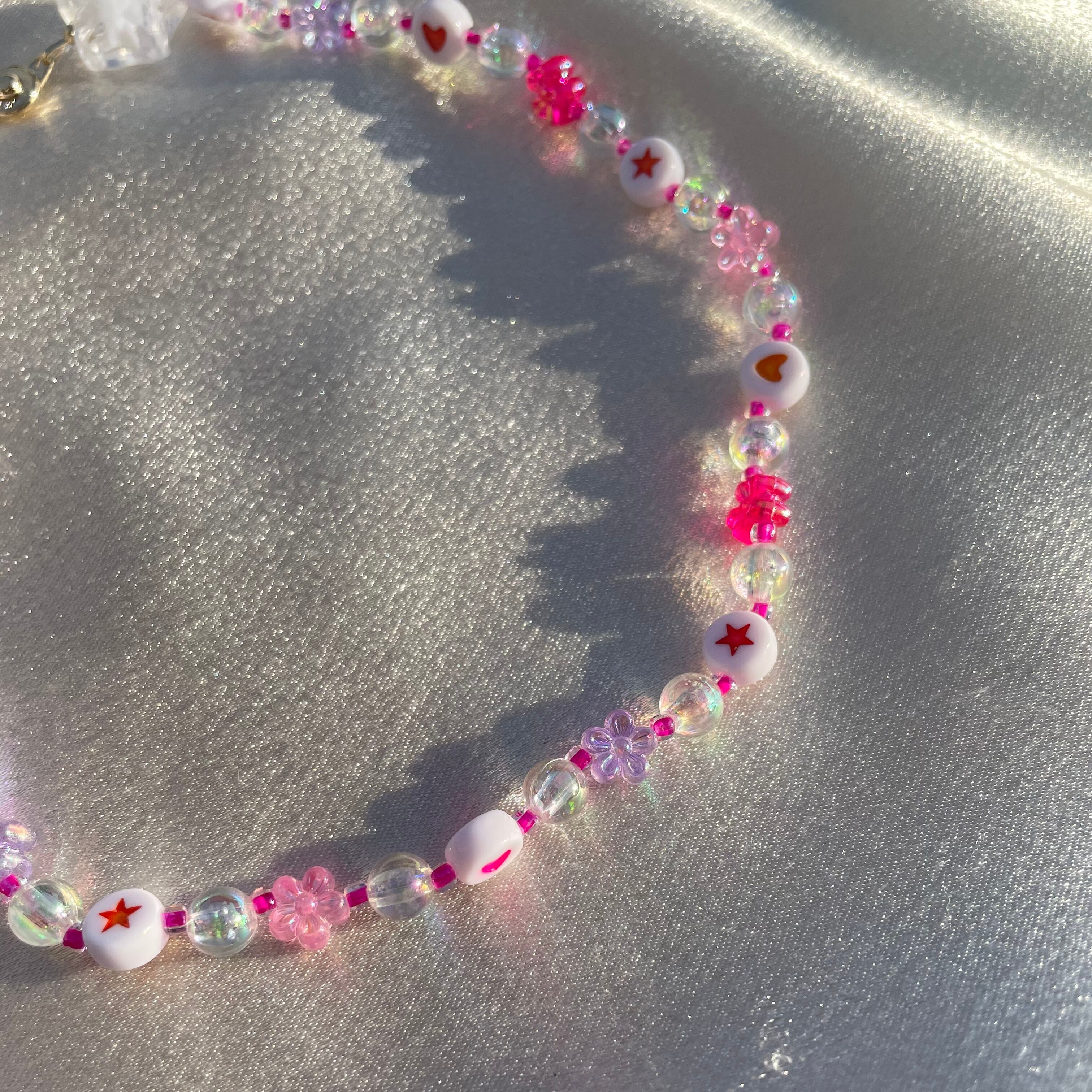 ピンク、パープルのオーロラ加工したフラワービーズがとにかく可愛い!それにプラスしてカラフルなスターハートビーズ(同じ色味をピックアップしています)を規則的に配置したチョーカー☆♡